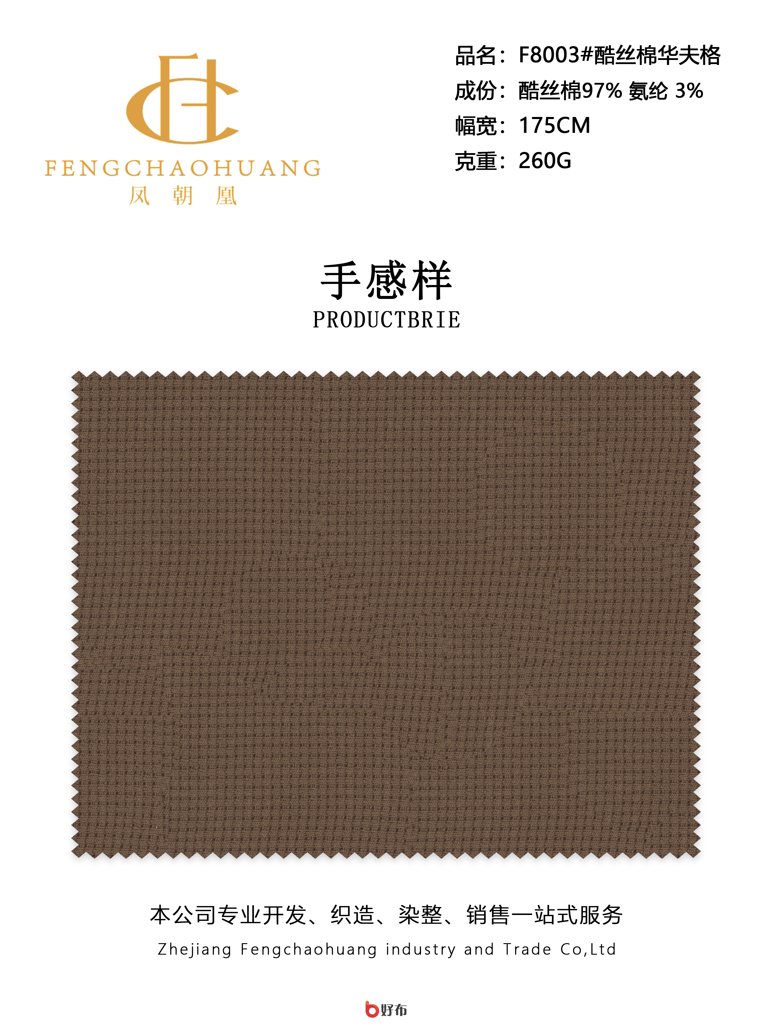 浙江凤朝凰工贸有限责任公司公司成立于2015年,注册资本1000万元人民币。集针织、染色、印花、后整理于一体,提供生产、销售、自营进出口一条龙服务,省去中间环节,源头厂家确保性价比
